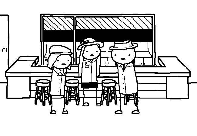 "Oh, shit." MS moves back against the bar, able to look at both of you now. "Hey, Amiable Bartender, could you grab us some drinks and give us some space?" She turns to you, "Dame'll take a water, and Detective... scotch?" PD shakes his head. "Okay, not drinking tonight, sure. Two waters, then?" PD nods this time, and AB brings out two glasses before heading into the back, giving the three of you privacy.