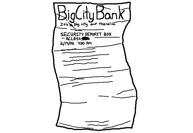 You take out the receipt, scanning it over. It's from the Big City Bank, alright. Seems that the gang went into a security deposit box... but there's no number for the box. It's been crossed out with pen. Most importantly, they did this earlier. Right at 4:30.